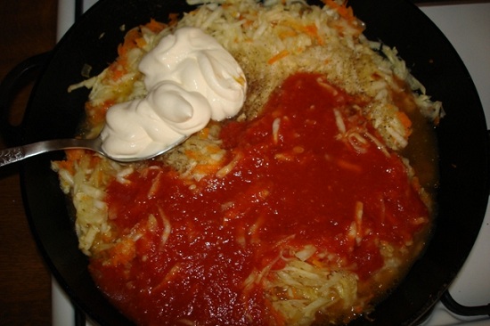 15. Вводим сметану, фильтрованную воду и пасту томатную.