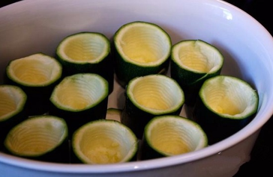 10. Фаршируем получившейся массой кабачки. Заполнять их нужно плотно.